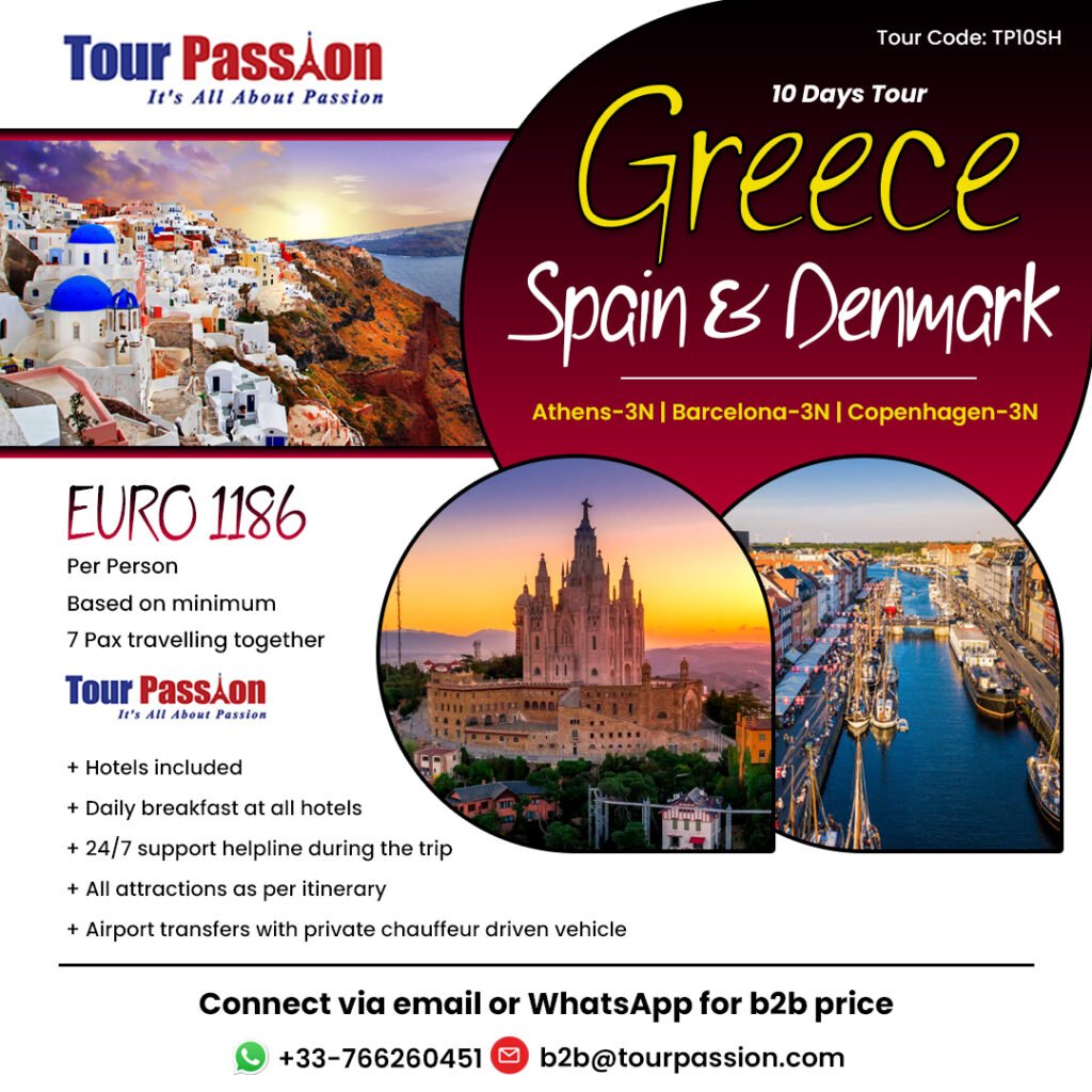 ટૂર પેશન યુરોપ મલ્ટી કન્ટ્રી ટૂર – 10 દિવસ ગ્રીસ સ્પેન ડેનમાર્ક હોટેલ્સ અને ટ્રાન્સફર્સ સાથે